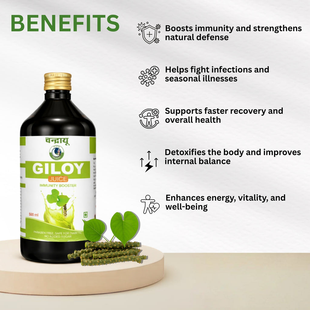 Giloy Juice is a powerful Ayurvedic immunity booster made from Tinospora cordifolia, also known as “Amrita.” This herbal formulation is specially designed to strengthen the immune system and improve the body’s natural resistance against infections.