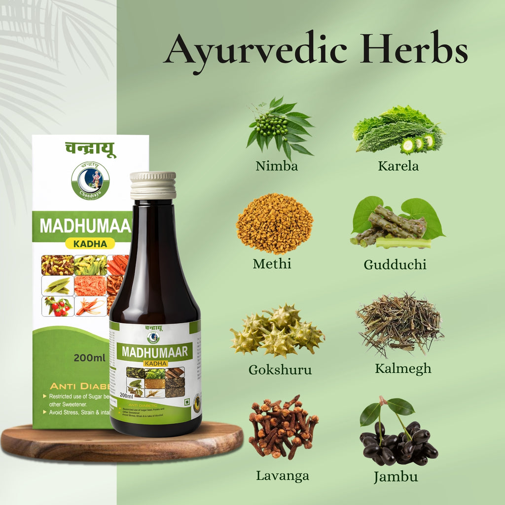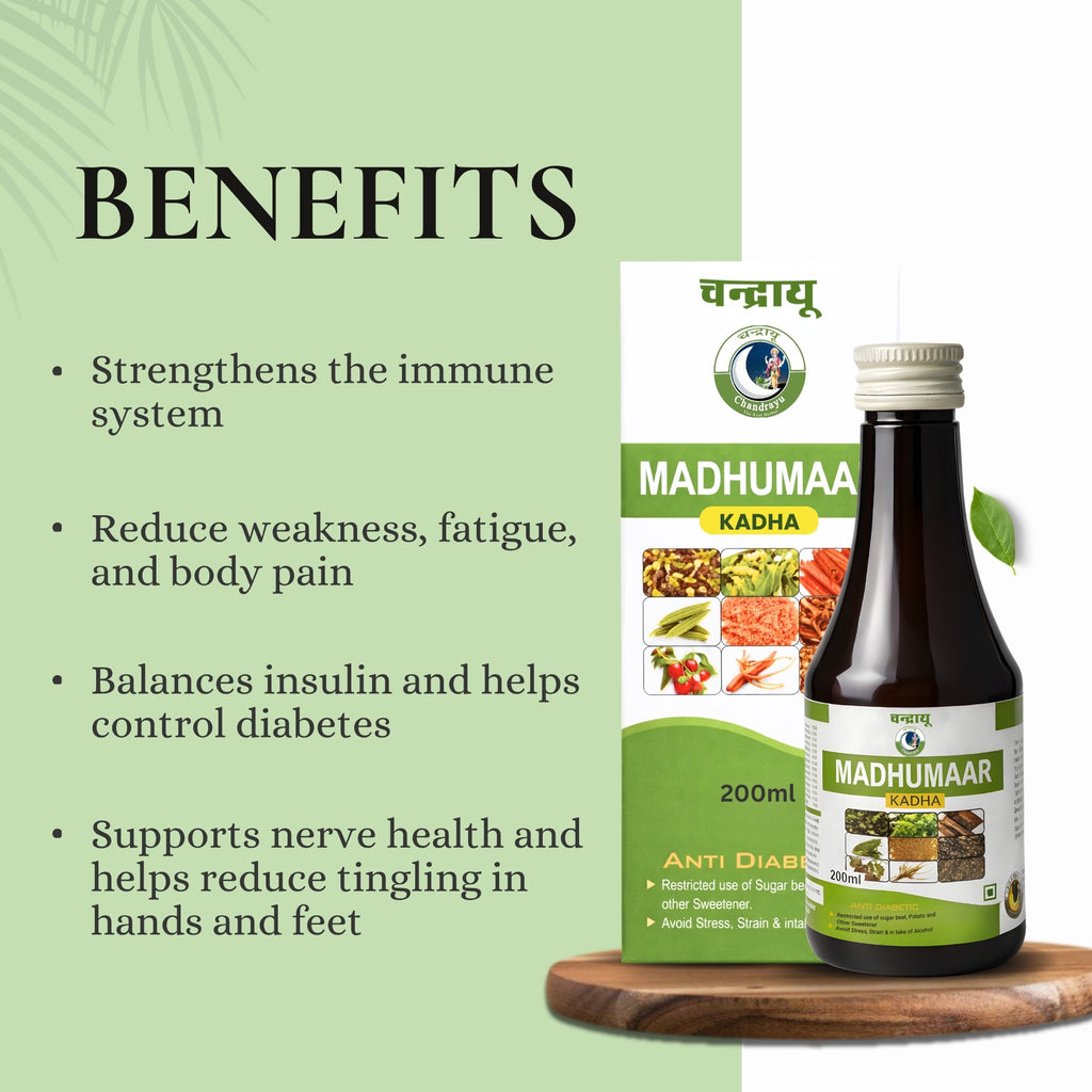 Madhumar Kadha is an Ayurvedic herbal formulation specially designed to help manage blood sugar levels naturally. It supports the proper functioning of the pancreas and helps maintain balanced insulin secretion, which assists in converting excess glucose into glycogen.