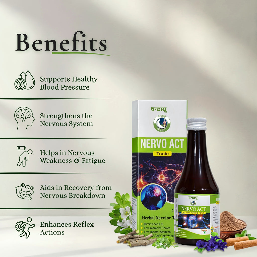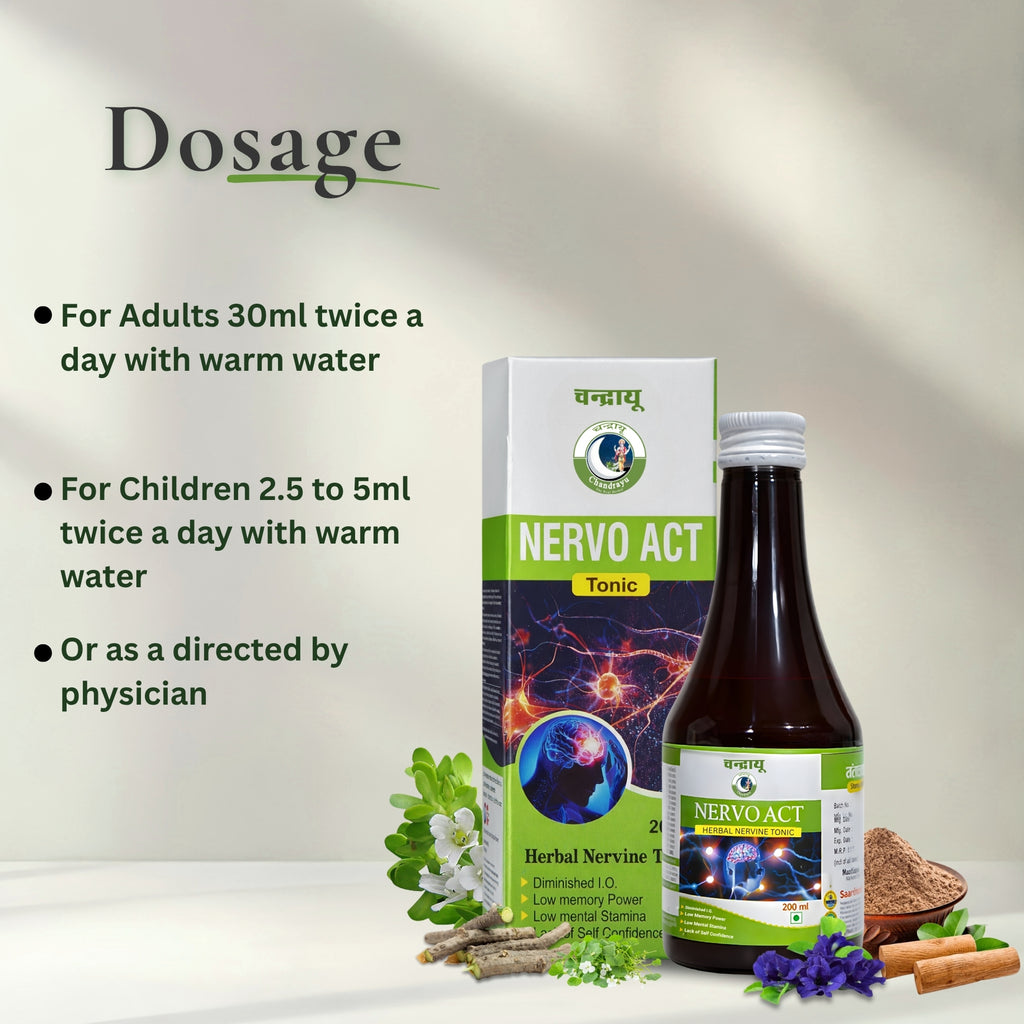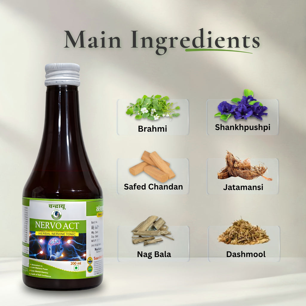 Nervo Act Syrup is an Ayurvedic herbal nervine tonic formulated to support brain health, improve memory, and strengthen the nervous system. It helps in managing issues like low memory power, mental fatigue, reduced concentration, and lack of confidence.